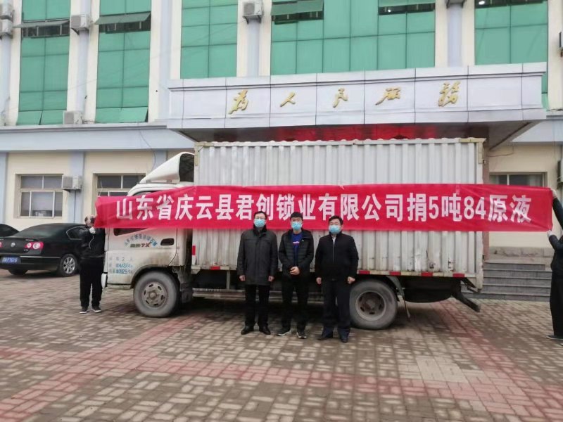 截至目前為止,新型肺炎疫情的局勢已經較嚴峻。疫病無情,人有情,為了與國家共同度過難關,于2月7日,山東省慶云縣君創(chuàng)鎖業(yè)有限公司為抗擊新型肺炎捐助5噸84原液。緊急支援,為堅決打贏疫情提供了綿薄之力!眾志成城,共戰(zhàn)疫情!這是一場沒有硝煙的人民戰(zhàn)爭,但我們有能力,也有信心,終將會取得勝利!